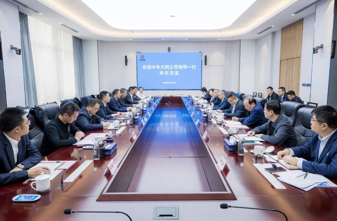 10月23日,中车大同电力机车有限公司党委书记、董事长付拥军一行到陕煤集团,与陕煤集团党委委员、副总经理袁广金座谈,双方围绕铁路轨道交通装备升级及新能源机⻋运⽤产业发展等内容进行交流。中车大同公司党委副书记、总经理王宇飞,副总经理高超参加座谈。